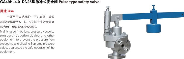 GA49H-4.0 DN25脈沖式安全閥主要用于電站鍋爐、壓力容器、減溫減壓裝置設(shè)備,防止壓力超過允許z高壓力值,保證設(shè)備安全運行